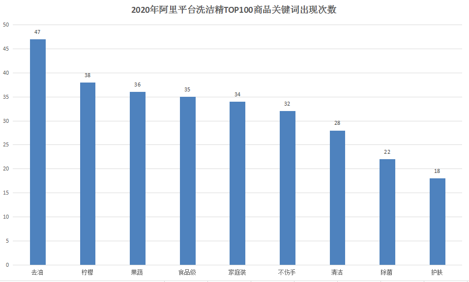 以數(shù)據(jù)看,2020年阿里平臺(tái)中TOP100的洗潔精產(chǎn)品,出現(xiàn)頻次最高的關(guān)鍵詞是“去油”,達(dá)到47次。其次是“檸檬”,出現(xiàn)次數(shù)達(dá)38次;而后是“果蔬”,次數(shù)有36次!可見(jiàn),在功效上,大部分消費(fèi)者追求洗潔精的“去油”,而在成分上,大部分消費(fèi)者都關(guān)注水果類成分。