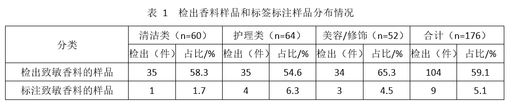 由表1可知,在176批次化妝品樣品中共有104批次樣品檢出一種或多種香料成分,占總樣品批數(shù)的59.1%。不同類型化妝品中香料成分的檢出率無明顯區(qū)別,美容/修飾類化妝品檢出致敏香料樣品占比為65.3%,略高于清潔類的58.3%和護理類的54.6%,主要因為52件美容/修飾類化妝品中,有21件香水,每件香水都檢出含有多種香料,香水中致敏香料較高的檢出率提升了美容/修飾類化妝品整體致敏香料檢出率。176批次調(diào)查樣品總體標簽標注率為4.5%,其中60件清潔類化妝品僅1件樣品標簽標注致敏香料。致敏香料的總體檢出率遠高于致敏香料標簽標示率,104件檢出致敏香料樣品僅有8件標簽標注了致敏香料中的一種或多種,其余96件檢出樣品僅標注“香精”字樣或無任何標示。