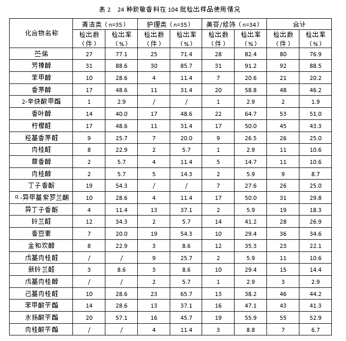 根據(jù)104批樣品檢測結(jié)果分析24種致敏香料成分在三大類化妝品中使用情況,見表2。