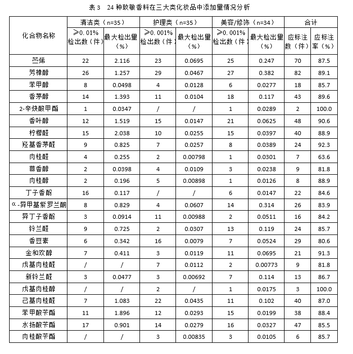 表3可知,歐盟化妝品法規(guī)規(guī)定符合“在不可沖洗型化妝品中含量≥0. 001%,在可沖洗型化妝品中含量≥0. 01%”條件時,化妝品香料中26種致敏原物質(zhì)必須在化妝品標簽上予以標注。按照這個規(guī)定,104批檢出樣品應(yīng)在標簽上進行標注的致敏香料除肉桂醛外其余23種香料的應(yīng)標注率都達到80%左右,這說明國產(chǎn)化妝致敏香料添加量大部分超過歐盟化妝品法規(guī)中致敏香料須標簽標注的限量要求,如果在標簽上標注出具體香料成分,則可有效避免消費者因無法獲知產(chǎn)品中香料的具體添加情況而可能出現(xiàn)選用不當造成安全問題。