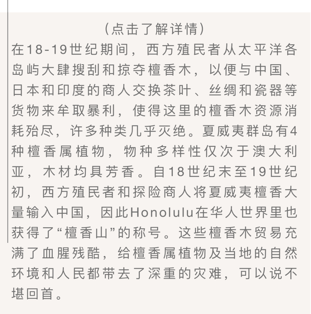 上乘的檀香木需百年成材,六十年以上剛能稱為老樹,一般砍伐后還要放置三十至四十年,木性才能真正達(dá)到醇化,氣味達(dá)到沉穩(wěn)溫和。但誰又能等到那么久呢,現(xiàn)在市面上能看見樹齡在三十年以上的檀香木已經(jīng)很少,更別提醇化的時(shí)間。大量千百年才積累的檀香木在幾年間要么被制作成工藝品,要么化作一縷縷輕煙飄散,地球上天然的檀香資源幾乎已經(jīng)消耗殆盡。