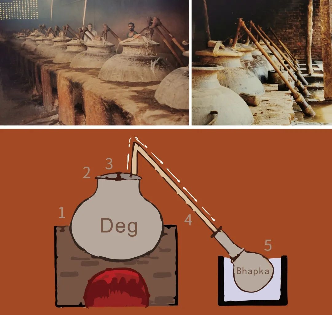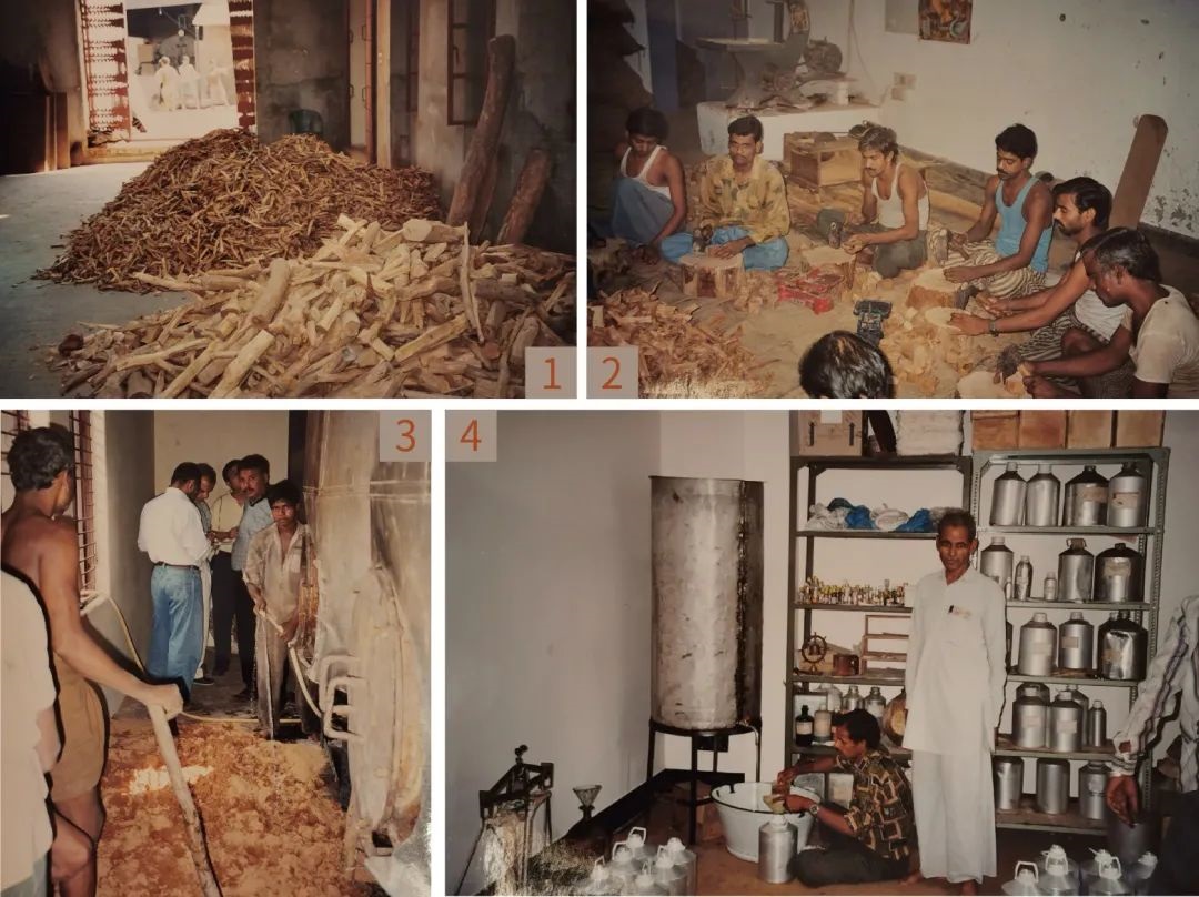 印度極富盛名的傳統(tǒng)檀香精油產(chǎn)品是Attar(Ittar)。Attar的生產(chǎn)工藝,即Deg 和Bhapka流程,非常獨(dú)特。一個(gè)裝置通常包括一個(gè)較大的可以直接加熱的銅罐(即Deg),用1-2個(gè)通常是竹子做的彎管連接到另一個(gè)較小的,里面盛著檀香精油銅罐(即Bhapka),這個(gè)小銅罐(Bhapka)放置于冷水池中進(jìn)行冷卻。生產(chǎn)時(shí),在Deg中按照配方放入水和不同的原料,如鮮花、香草料、香辛料、焙過的泥土等原料,連接并密封Deg和Bhapka及彎管后,直接用明火加熱Deg進(jìn)行蒸餾,餾出的香氣成分經(jīng)過竹管后進(jìn)入Bhapka,經(jīng)過冷水冷卻后,直接被Bhapka中的檀香精油吸收。蒸餾結(jié)束后,吸收了餾出香氣的檀香精油再經(jīng)過多年的陳化就完成了成品Attar。與調(diào)香師調(diào)香一樣,Deg中原料的配方和比例就是調(diào)香的秘密,決定了最終Attar的香氣特征。用玫瑰花瓣這樣生產(chǎn)出來的Attar就叫玫瑰Attar。