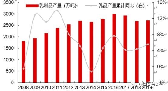圖6 中國(guó)乳品產(chǎn)量維系穩(wěn)定增長(zhǎng)