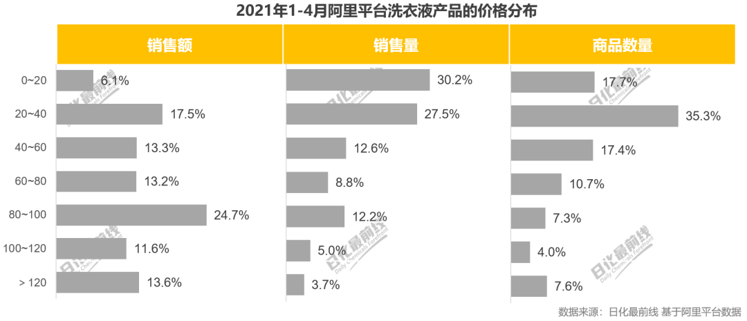 從銷售額來看,2021年1-4月阿里平臺上80-100元的洗衣液產(chǎn)品最受歡迎,其次是20-40元的低端價位和大于120元的高端價位產(chǎn)品;從銷售量上看,0-20元和20-40元區(qū)間的低端價位產(chǎn)品銷售量最好。