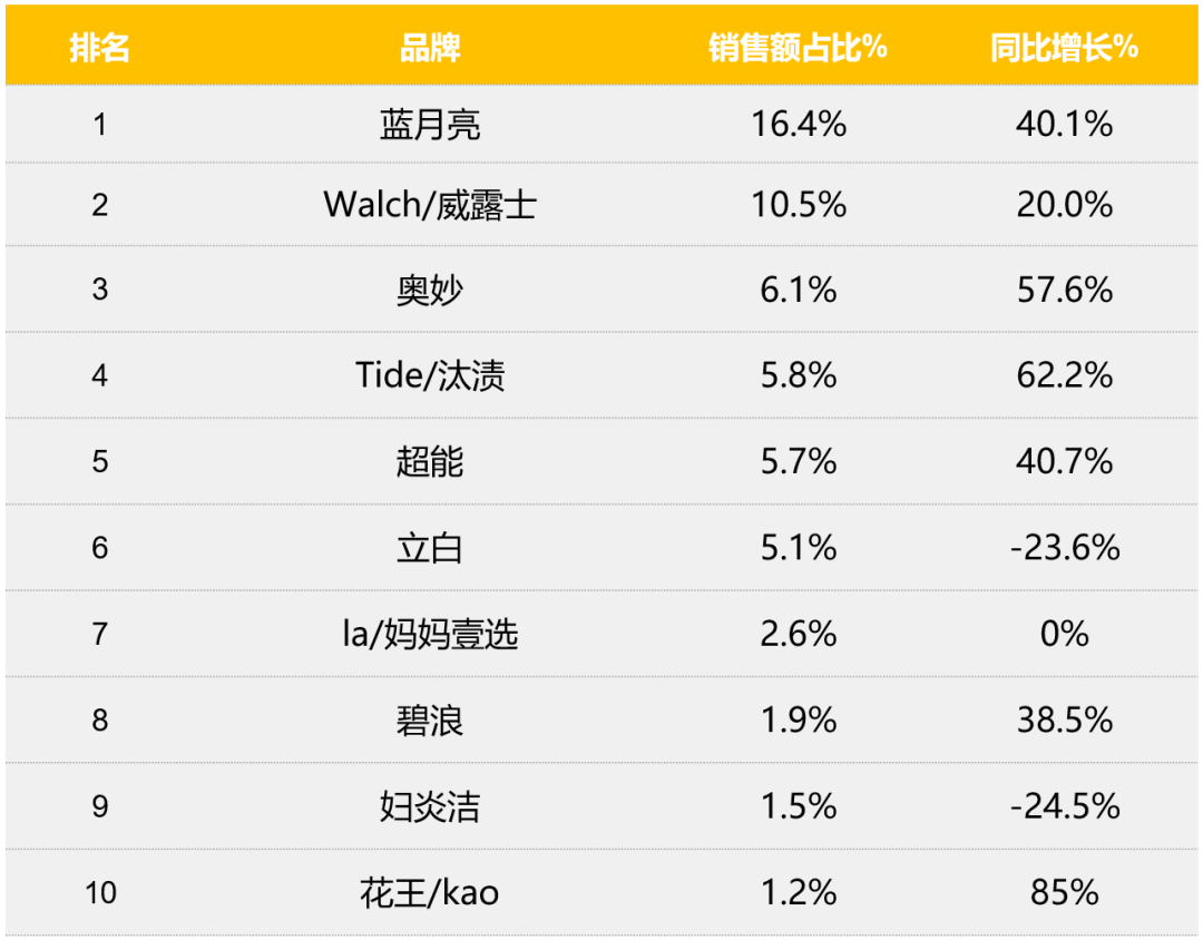 TOP10洗衣液品牌同比均有不同程度的增速,其中花王/kao同比增速較快,達(dá)到85%。