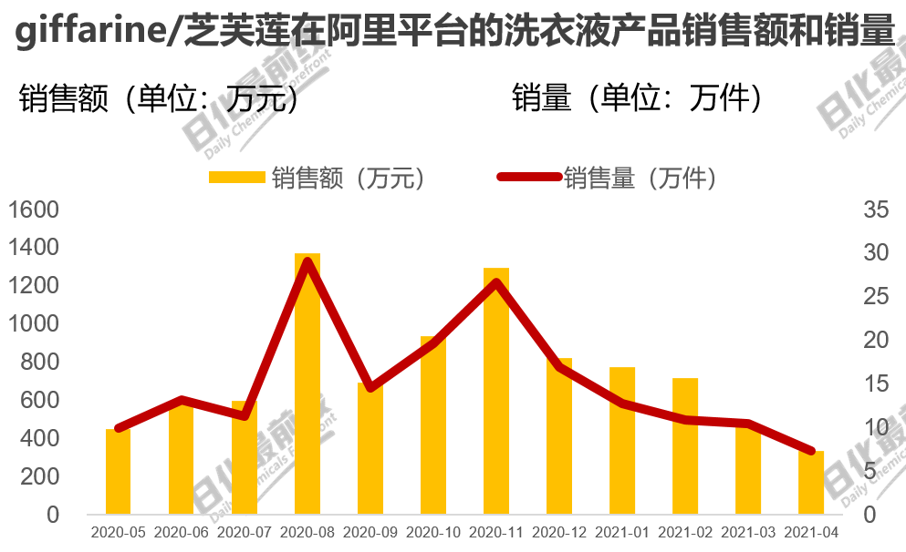 2021年1-4月阿里平臺giffarine/芝芙蓮洗衣液銷售額超過2192萬元,市場份額約為1%,銷量超41萬+件;主要熱銷產(chǎn)品為主打的內(nèi)衣褲專用洗衣液。