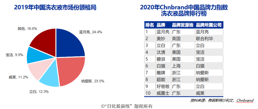 2019年洗衣液TOP5品牌占比達81.4%,藍月亮以24.4%的占比排名第一,納愛斯(旗下品牌雕牌、超能等)和立白緊隨其后。Chnbrand中國品牌力指數(shù)洗衣液品牌排行榜顯示,2020年藍月亮穩(wěn)居榜首;其次為奧妙和立白。