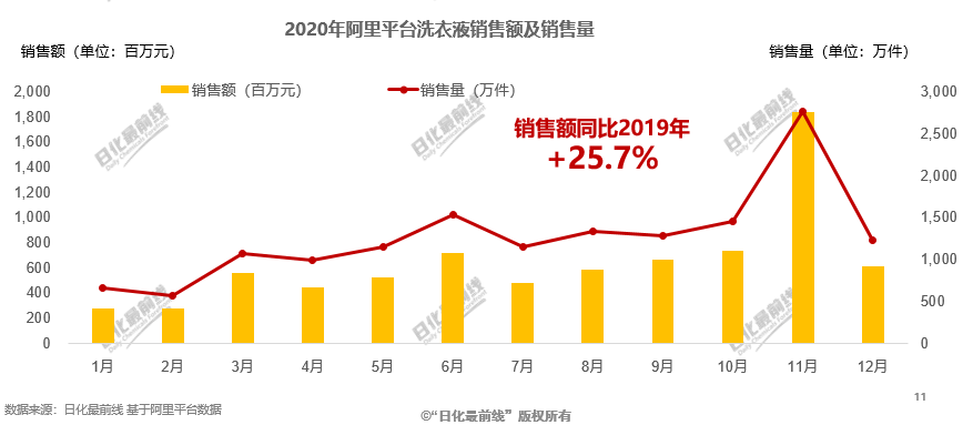 2020年阿里平臺洗衣液總體銷售額超過77億元,銷量超過15150萬件+。11月銷售額最高,達到18億元,得益于雙11的活動促銷,銷售額增長迅猛。