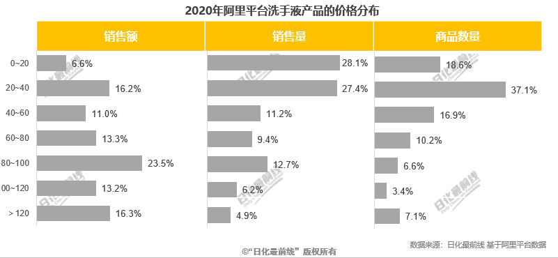 從銷售額來看,2020年阿里平臺上80-100元的洗衣液產(chǎn)品最受歡迎,其次是20-40元的低端價位和大于120元的高端價位產(chǎn)品。從銷售量上看,0-20元和20-40元區(qū)間的低端價位產(chǎn)品銷售量最好。