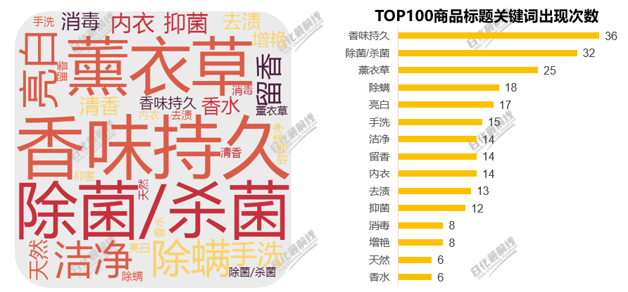 熱銷洗衣液產(chǎn)品大多強調(diào)其抑菌殺菌香味持久的功效,另外薰衣草香味、除螨、亮白潔凈等效果也受歡迎。