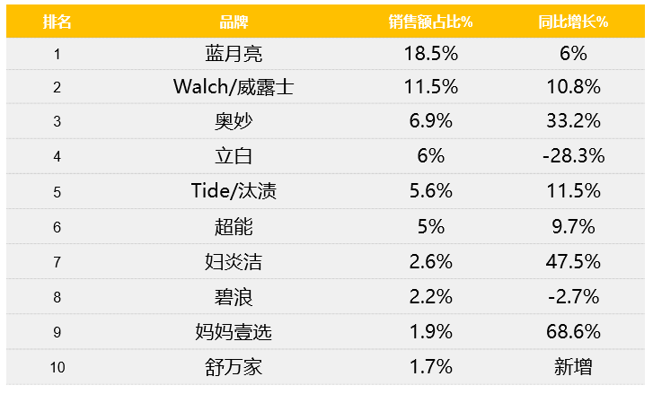 TOP10洗手液品牌同比均有不同程度的增速,其中媽媽壹選同比增速較快,達到68.6%,其次 是婦炎潔,47.5%。