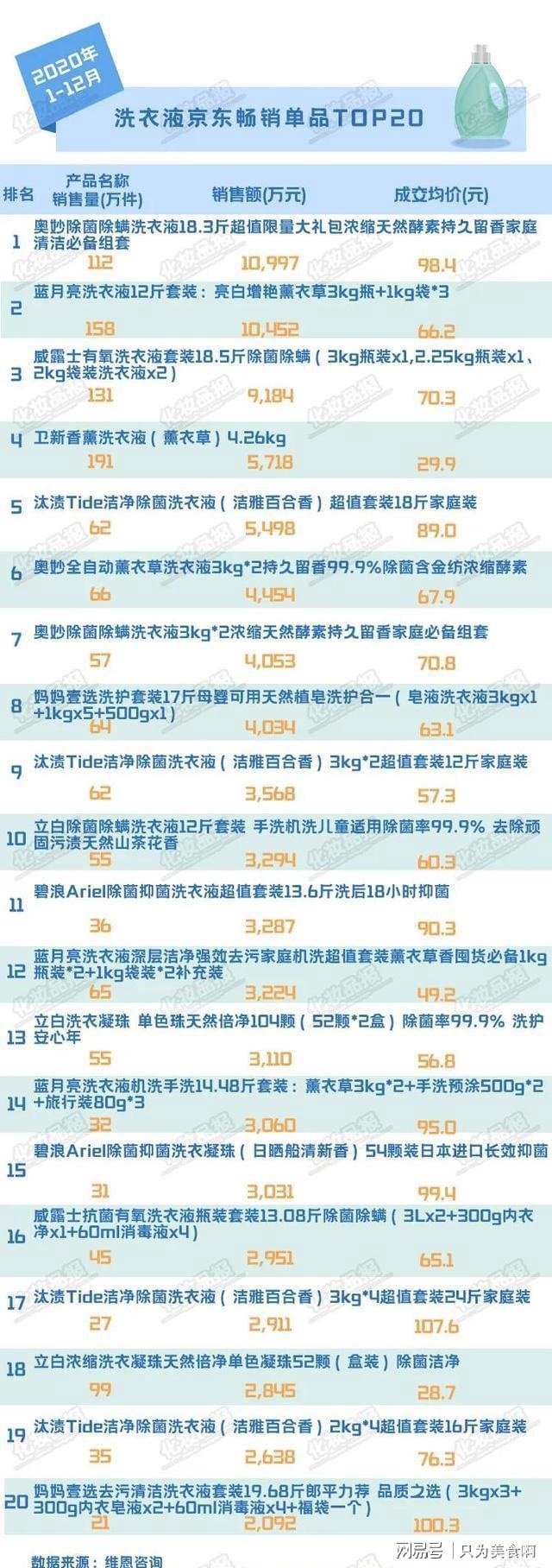 在2020年洗衣液京東暢銷單品TOP20中,專為機洗設(shè)計,一次使用一顆,多重香味任選的洗衣凝珠憑借著操作的便捷性與實用性也沖入榜單。榜單中,立白、碧浪的洗衣凝珠均取得了亮眼的成績。