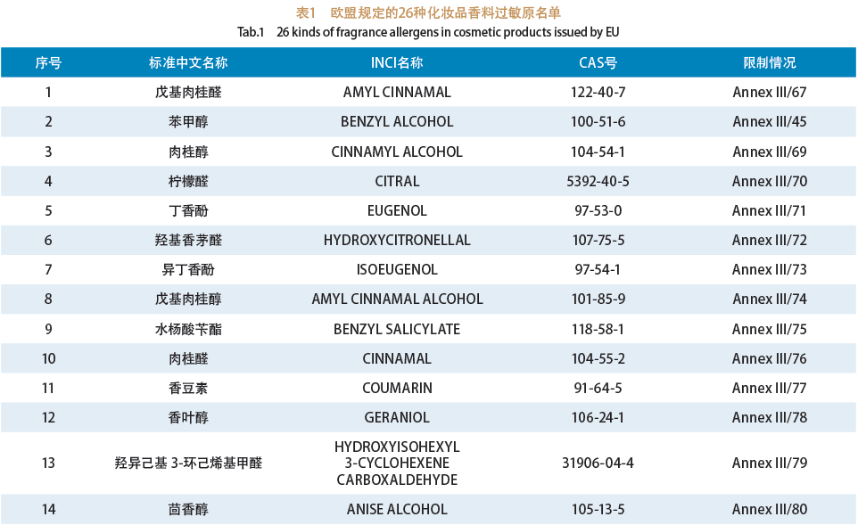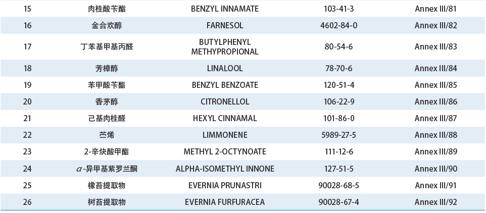 2、2009年歐盟公布了化妝品法規(guī),這使歐盟化妝品監(jiān)管的主要依據(jù)由指令上升為法規(guī)。對(duì)于化妝品中禁用的香料,歐盟幾乎全部接收IFRA提出的禁用名單。此外關(guān)于化妝品中限用香料歐盟還在法規(guī)中規(guī)定符合“在不可沖洗型化妝品中含量≥0.001%;在可沖洗型化妝品中含量≥0.01%”條件時(shí),化妝品香料中26種致敏原物質(zhì)必須在化妝品標(biāo)簽上予以標(biāo)注(在歐盟化妝品指令2005年修訂前規(guī)定香料成分免于標(biāo)簽標(biāo)注,僅以“香料或香精”標(biāo)出即可)。