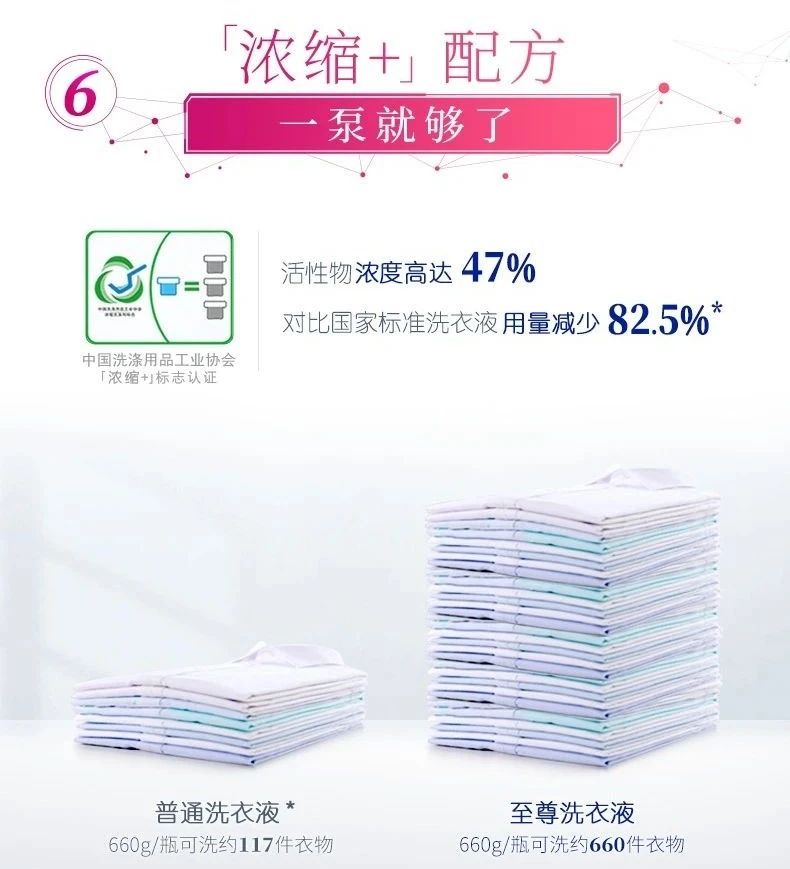 此前,藍(lán)月亮推出了“至尊濃縮洗衣液”,用量為普通洗衣液的1/3,一泵清洗8件衣物,由此解決了消費者困惑的用量問題。