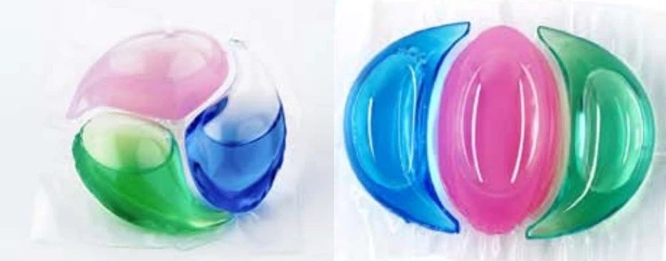 看完了單腔的洗衣凝珠制作,三腔就好理解了。一生二,二生三,只需要在一開始的吸合過程中,開的模具是三腔體即可,其他的環(huán)節(jié)都一樣。話說,一般三腔分離的好處是為了讓洗滌劑、柔順劑、消毒劑各自獨立,只有在用的時候才混在一起,化學性能更穩(wěn)定。