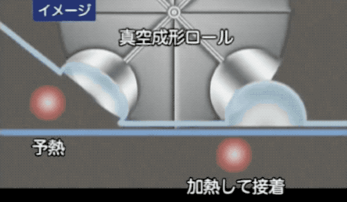 制作泡泡紙的原理,看示意圖里紅色的是熱源,用來加熱上下兩層薄膜,上面一層薄膜被吸出了泡泡,下面一層趕緊加熱按在經(jīng)過滾輪的塑料膜上,兩層就黏合在一起了,這出來的就是一個完整的密封泡泡紙了。