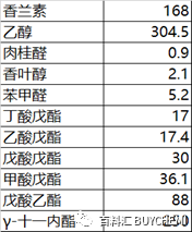 其他香料包括:β-紫羅蘭酮、異茉莉酮、乙醛、香茅醛、苯甲醛、玫瑰醛、桑葚醛、桃醛、香草醛、乙基香草醛、肉桂醛;苯甲醇、苯乙醇、芳樟醇、戊醇、香葉醇、L-香茅醇、松油醇、苯基烯丙基醇;α-甲基丁酸、甲基鄰氨基苯甲酸;朗姆醚、己酸醚、己酸醚凈油、酸橙橙花油、金合歡凈油、香檸檬葉油、肉桂油、香葉油、苦杏仁油、丁香油、多香果油、苦橙油、橙花油、香檸檬油、甜橙油、冷榨檸檬油、橙葉油、橘子油萜、橘子油、纈草油、茴香精油、月桂精油、苦杏仁精油、干邑精油、芫荽精油、檸檬精油、玫瑰凈油、啤酒花提取物、春黃菊羅木提取物、番石榴濃縮物、香蘭素等。
