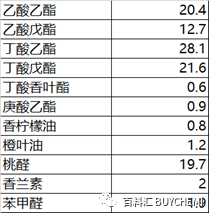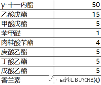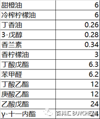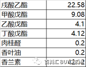 (3)介于上面兩種配方之間,由γ-十一內(nèi)酯、乙酸戊酯、丁酸戊酯、戊酸戊酯、乙酸乙酯、辛酸乙酯、肉桂酸乙酯、庚酸乙酯、苯乙酸乙酯、乙基香草醛以及斯里蘭卡肉桂精油、鼠尾草精油、檸檬精油、多香果精油以及甜橙精油組成。