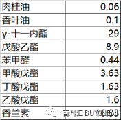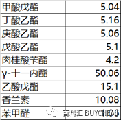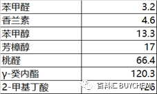 羰基化合物:乙醛、丁醛、異戊醛、2-糠醛、己醛、反-2-己烯醛、反-2-反-4-己二烯醛、庚醛、順-2-庚烯醛、辛醛、壬醛、反-2-壬烯醛、癸醛、十一醛、苯甲醛、苯乙醛、肉桂醛、香芹蓋烯醛、1-戊烯-3-酮、2-庚酮、1-辛烯-3-酮、3-壬烯-2-酮、2-十一酮、α-紫羅蘭酮、β-紫羅蘭酮、香葉基丙酮、6-甲基-5-庚烯-2-酮等。