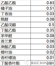 (4)進(jìn)一步改善的桃子香精代表配方為,由γ-十一內(nèi)酯、乙酸戊酯、丁酸戊酯、甲酸戊酯、己酸乙酯、戊酸乙酯、香草醛、苦杏仁精油、肉桂精油、香葉精油、苦橙精油、纈草精油以及少量的γ-壬內(nèi)酯組成。