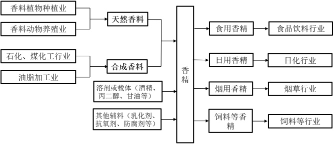香精香料行業(yè)的上游包括香料植物種植、香料動(dòng)物養(yǎng)殖、石化煤化工和油脂加工等行業(yè),下游主要為食品飲料、日化、煙草、飼料等行業(yè)。