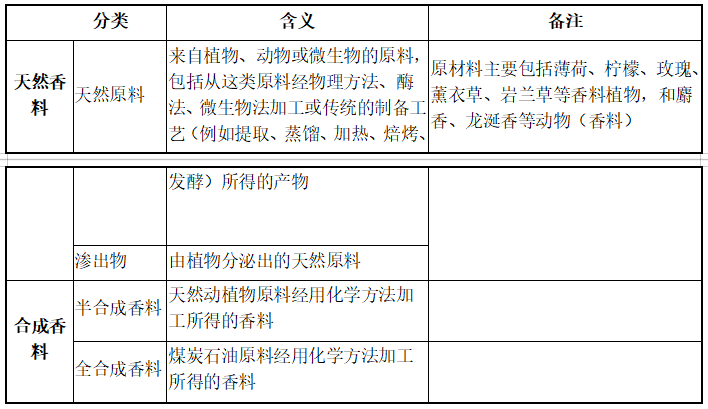 按原料來(lái)源及制造工藝的不同,香料分成天然香料和合成香料。天然香料的優(yōu)點(diǎn)是主要成分來(lái)源于天然,相對(duì)而言符合健康理念,產(chǎn)品味道層次豐富,但由于受到自然條件限制,數(shù)量有限,價(jià)格相對(duì)較高;合成香料通常由化工原料通過(guò)化學(xué)手段合成制成,合成香料的優(yōu)點(diǎn)是原材料來(lái)源廣泛,產(chǎn)品品類(lèi)較天然香料豐富,缺點(diǎn)是味道層次單一,需要組合調(diào)配使用。