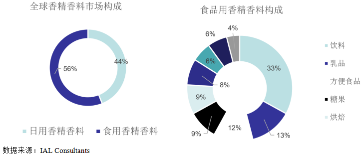 而全球香精香料市場(chǎng)中,食品用香精香料占比為56%,日用香精香料占比約為44%。食品用香精又可以分為多個(gè)種類(lèi),其中規(guī)模占比最大的為飲料,約占食品用香精規(guī)模的33%,而煙草用香精實(shí)際占比不足4%。