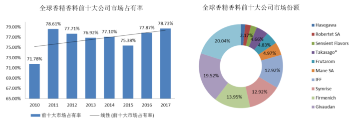 全球香精香料產(chǎn)業(yè)呈現(xiàn)高度壟斷格局,國(guó)際十大香精香料公司多集中于發(fā)達(dá)國(guó)家,代表企業(yè)有瑞士的奇華頓和芬美意、美國(guó)的國(guó)際香料香精和森馨、德國(guó)的德之馨、法國(guó)的曼氏和羅伯特,以及日本的高砂和長(zhǎng)谷川等。在20世紀(jì)80年代,發(fā)達(dá)國(guó)家香料香精企業(yè)仍處于高度分散狀態(tài),自90年代以來(lái),行業(yè)集中程度明顯加速,核心生產(chǎn)企業(yè)市場(chǎng)地位日趨穩(wěn)固,2017年前十大生產(chǎn)企業(yè)市占率達(dá)78.73%,頭部公司奇華頓的全球市場(chǎng)份額就高達(dá)20%。隨著2018年國(guó)際香料香精完成對(duì)花臣的收購(gòu),行業(yè)市場(chǎng)集中度更趨明顯。