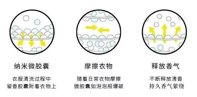在洗滌時(shí)洗滌劑中的微膠囊香精會(huì)散落于織物纖維的間隙中,當(dāng)衣物干燥后 ,織物中的微膠囊香精通過觸碰或摩擦破裂,就會(huì)釋放出香氣,從而達(dá)到持久留香的效果。