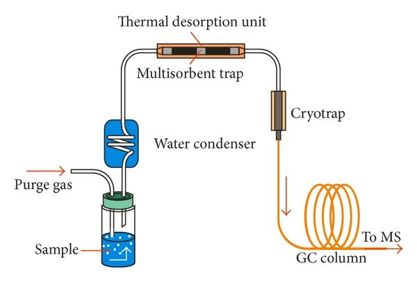吹掃和捕集方法(動態(tài)技術(shù))的基礎(chǔ)是用惰性氣體(通常是氦氣或氮?dú)猓┐祾邩悠罚ㄒ后w或固體);然后將揮發(fā)性化合物吸附在捕集器上,捕集器立即被加熱,將其解吸到氣相色譜儀進(jìn)樣器中。有許多吸附劑,如Porapaks、Chromosorbs或Tenax系列,都能滿足正確的熱解吸的必要要求;然而Tenax系列(基于2,6-二苯基對苯二胺的聚合物)非常適用于水醇樣品,如葡萄酒或類似的飲料。在這個意義上,已經(jīng)提出使用吹掃和捕集方法來分析水果和果汁以及酒精飲料。