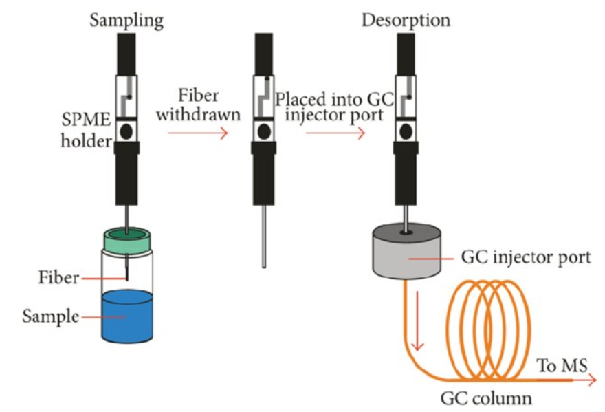 SPME是一種無溶劑的方法,集成了采樣、提取和濃縮分析物的功能。與溶劑萃取相比,SPME是一種非完全的萃取技術(shù),只有一小部分目標(biāo)分析物從樣品基質(zhì)中被萃取出來。這種技術(shù)的好處是便于攜帶,有可能實(shí)現(xiàn)自動化,并提高靈敏度,此外,在頂空(HS)模式下使用時,被動采樣方法不會干擾樣品。